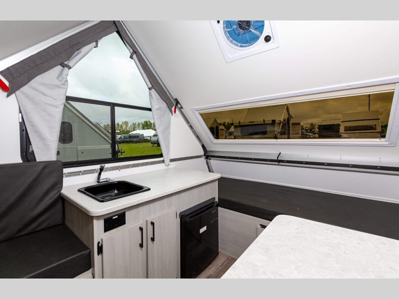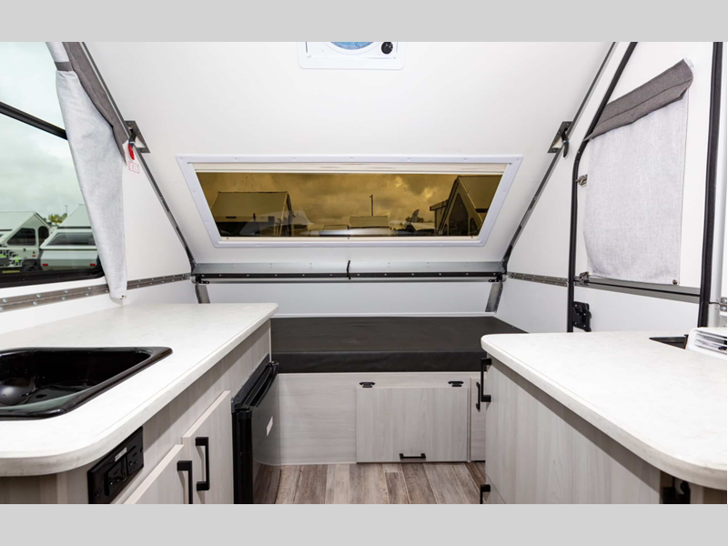Each is built lightweight with an Azdel composite roof/sidewalls for added durability, and there are four stabilizer jacks for stability. The interior provides sleeping accommodations on a front bed or the converted dinette, a sink to wash up, and storage for your clothing, gear and such.