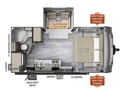 Sleeps 2 Slides 1 Length 23 ft 10 in Ext Width 8 ft Ext Height 10 ft 11 in Hitch Weight 634 lbs Dry Weight 5132 lbs Cargo Capacity 1662 lbs Fresh Water Capacity 54 gals Grey Water Capacity 29 gals Black Water Capacity 29 gals Furnace BTU 35000 btu Available Beds Queen Refrigerator Type 12 Volt Cooktop Burners 3 Number of Awnings 1 LP Tank Capacity 30 Water Heater Type Quick Recovery AC BTU 15000 btu TV Info LR 12V TV Awning Info 18' Power with Adjustable Rain Dump and LED Lights Axle Count 2 Number of LP Tanks 2 Shower Type Radius Similar Travel Trailer Floorplans