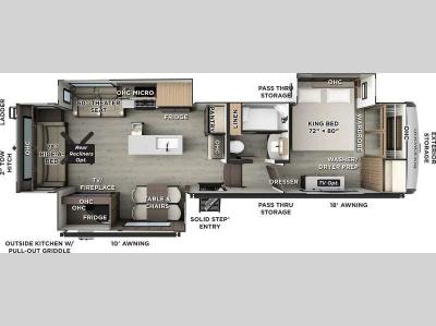 Sleeps 4 Slides 3 Length 37 ft Ext Width 8 ft Ext Height 13 ft 2 in Hitch Weight 1831 lbs Dry Weight 10519 lbs Cargo Capacity 1712 lbs Fresh Water Capacity 54 gals Grey Water Capacity 80 gals Black Water Capacity 50 gals Tire Size 16" Furnace BTU 35000 btu Available Beds King Refrigerator Type Residential Cooktop Burners 3 Number of Awnings 2 LP Tank Capacity 30 lbs Water Heater Capacity 12 gal Water Heater Type Quick Recovery Gas/Electric AC BTU 30000 btu TV Info LR Smart TV Awning Info 10' and 13' Power w/Rain Dump and LED Lights Axle Count 2 Washer/Dryer Available Yes Number of LP Tanks 2 Shower Type Shower w/Seat Electrical Service 50 amp Similar Fifth Wheel Floorplans