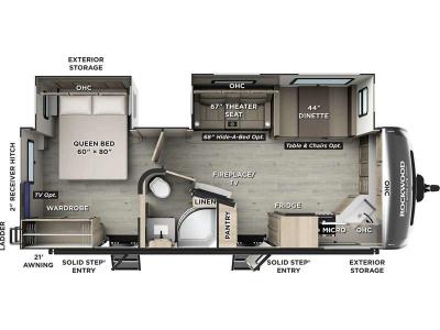 Sleeps 3 Slides 2 Length 29 ft 8 in Ext Width 8 ft Ext Height 11 ft 2 in Hitch Weight 902 lbs Dry Weight 6876 lbs Cargo Capacity 1826 lbs Fresh Water Capacity 54 gals Grey Water Capacity 90 gals Black Water Capacity 45 gals Furnace BTU 35000 btu Available Beds Queen Refrigerator Type 12V Cooktop Burners 3 Number of Awnings 1 LP Tank Capacity 20 Lbs. Water Heater Capacity 6 gal Water Heater Type Gallon Quick Recovery Auto Ignite Gas/Electric AC BTU 15000 btu TV Info LR Smart TV Awning Info 21' Power Awning w/ Adjustable Rain Dump & LED Lighting Axle Count 2 Number of LP Tanks 2 Shower Type Radius Electrical Service 50 amp Solar Wattage 200 watts Similar Travel Trailer Floorplans