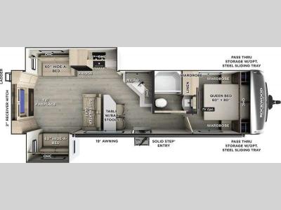 With dual slides at the rear, this Rockwood Ultra Lite travel trailer offers a spacious living area for entertaining or relaxing. Gather the whole gang for movie night with three cozy seating options facing the TV and fireplace, including two 60" hide-a-bed sofas and a 60" theater seat. A table with bar stools adds more seating and doubles as a dining spot, overlooking the TV. Overhead storage throughout the living area and kitchen provides plenty of room to stow away groceries, dishes, books, and board games, keeping everything organized. Let´s not forget the full bathroom with a large shower offers a comfortable place to refresh, while the front bedroom features a queen bed and two wardrobes for storing all your essentials.