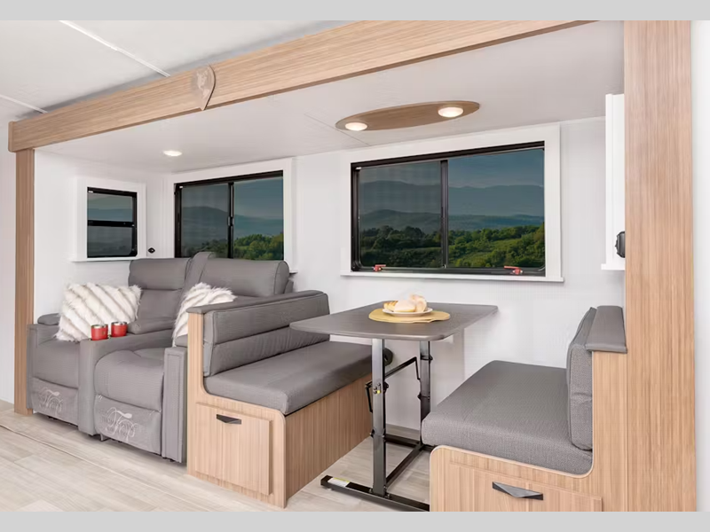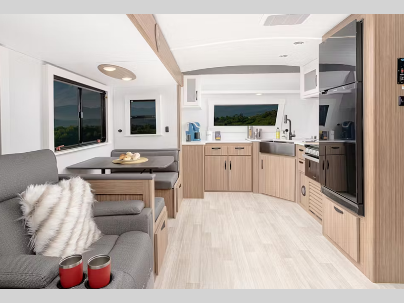 Each one is constructed with a seamless, laminated and gel-coated filon exterior, a fully walkable roof, and a high impact thermoset resin painted front cap for added protection. You'll love the residential and durable Beauflor vinyl flooring inside, along with Frosted Cedar woodgrain cabinetry and deluxe night shades. The exterior is just as accommodating with its outside shower, Edge View line lighting in the front and rear, plus power stabilizer jacks to name a few conveniences.