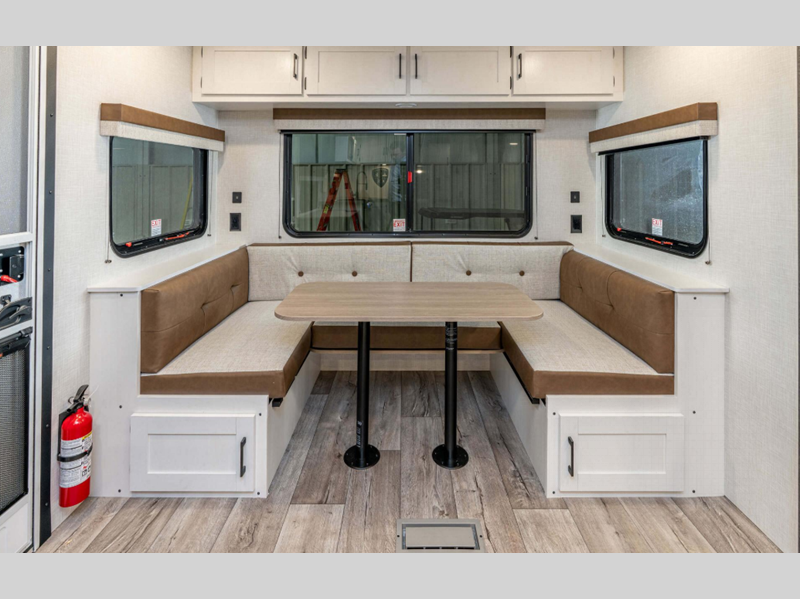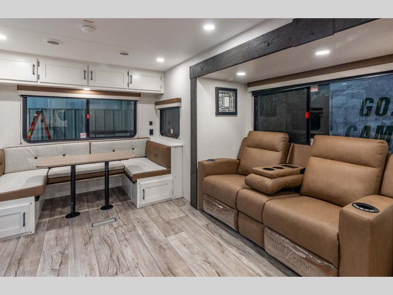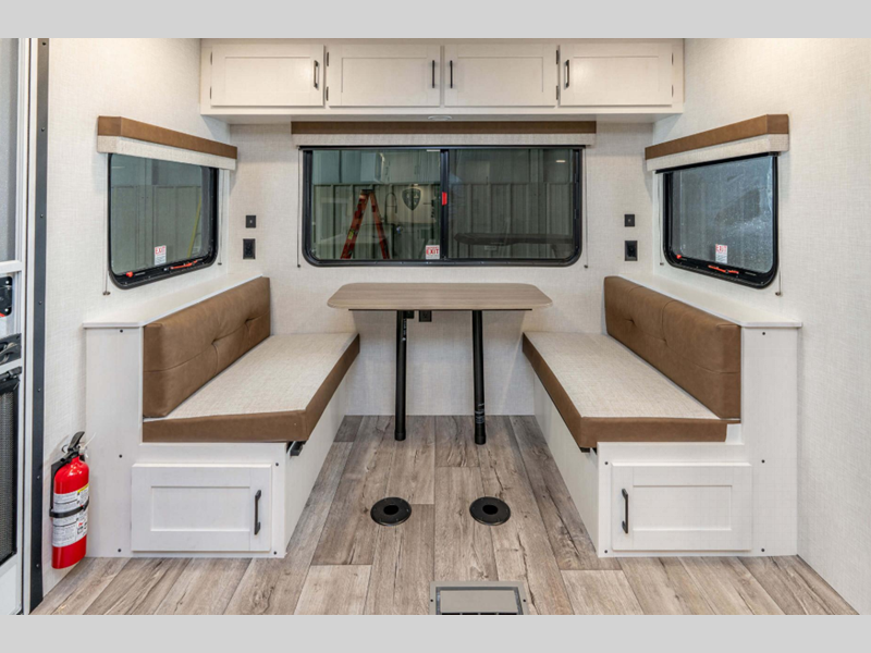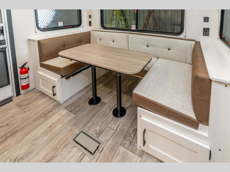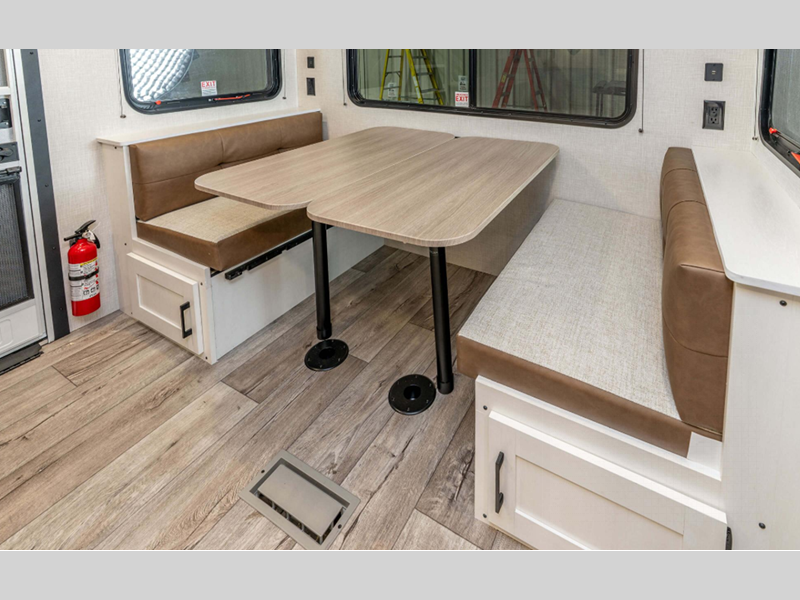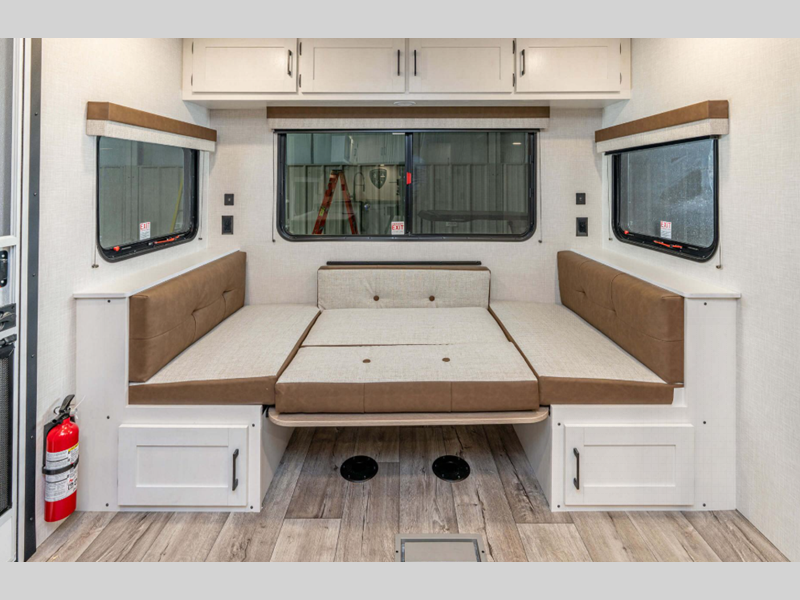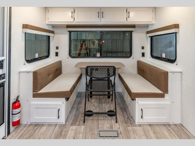 Inside, the modern farmhouse design will let you bring a touch of home wherever you go, and since there is Beauflor throughout with no carpet, it will be easy to clean up after a weekend at the lake. You will also find custom backsplash in the kitchen, motion activated lighting in the bath, and max size closets in the bedroom for your personal belongings. The power stabilizer jacks will make set up easier than ever and there is motion sensor lighting in the pass-thru if you happen to get to the campground late at night.
