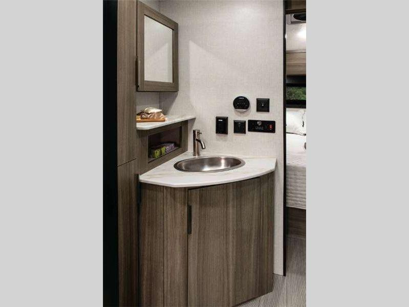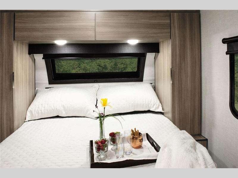 Each Sonic is built with AZDEL Onboard RV composite panels, a seamless one-piece fiberglass roof, tandem axles with auto-adjust brakes, and Secure Stance angle stabilizer jacks for an easy setup. The Weather-Shield package is mandatory and offers a forced-air heated and enclosed underbelly allowing you to camp during any climate. Some additional highlights you are sure to love include the panoramic automotive front window and an entry door with a clear-view window for great views and natural lighting inside, hand-glazed Heirloom Maple cabinet doors for style, and the Go Power mounted solar prep.